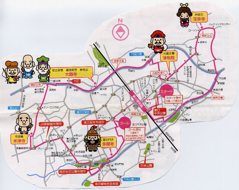 ![]() 妻と一緒に東久留米七福神めぐり 歩行距離:約8km、約3時間(左の図は西部グループ主催のコース図) コース:東久留米東口中央公園(スタート)10:20→落合川沿い→宝泉寺(弁財天)→浄牧院(大黒天尊)→黒目川沿い→大いん寺(恵比寿尊、福禄寿尊、寿老尊)→米津寺(布袋尊)→南沢湧水地→多聞寺(毘沙門天)→東久留米市役所(ゴール)13:30 途中の落合川、黒目川にはサギやカモ、ニシキゴイなどたくさん見られ水も比較的澄んでおり川沿いは散歩するには環境のよいところである。黒目川沿い民家の木にフクロウもいた。