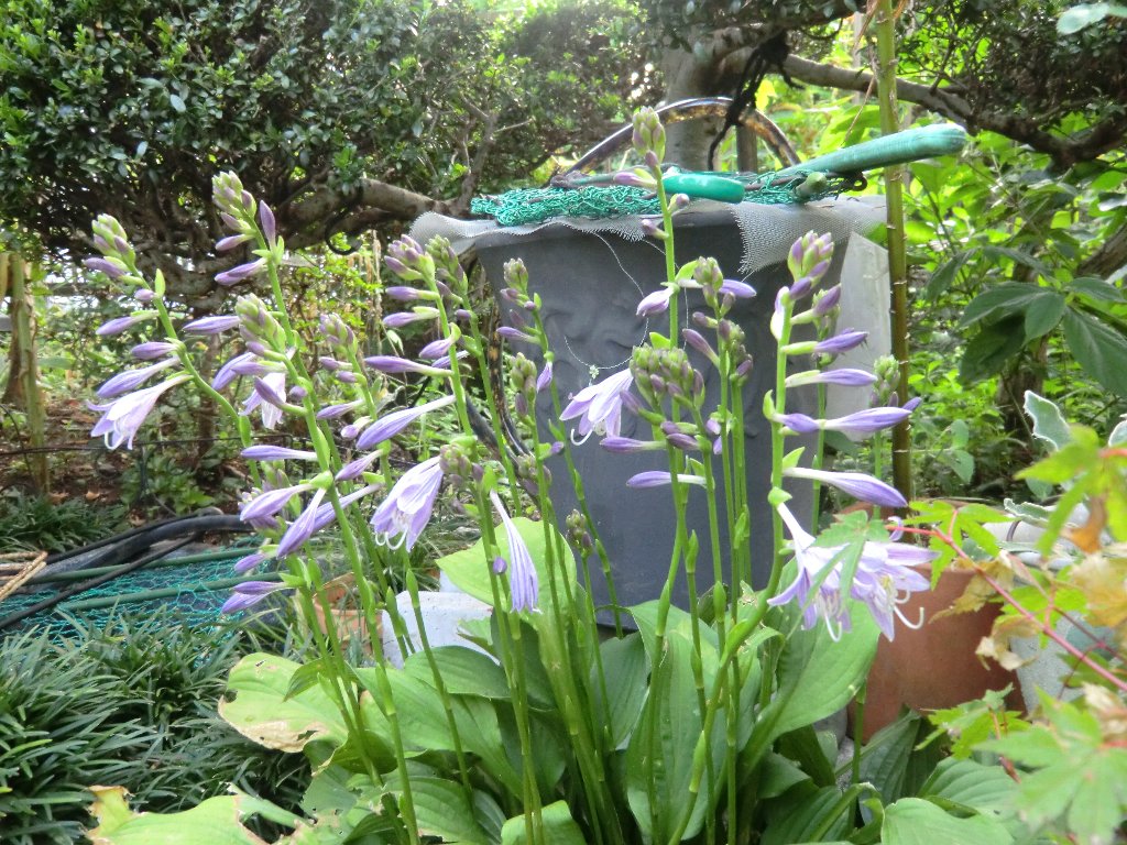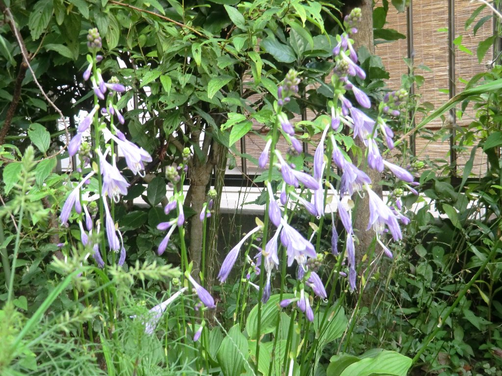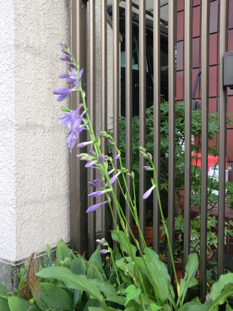 野生のギボウシの種から育てたギボウシが鮮やかな紫色で見ごろを迎えた。 ギボウシはユリ科の多年草で種からよく繁殖し、日陰でも日当たりでもよく育ち丈夫である。 我家では玄関前のプランタン以外に、瓢箪池際や庭木の中など数箇所で咲いている。