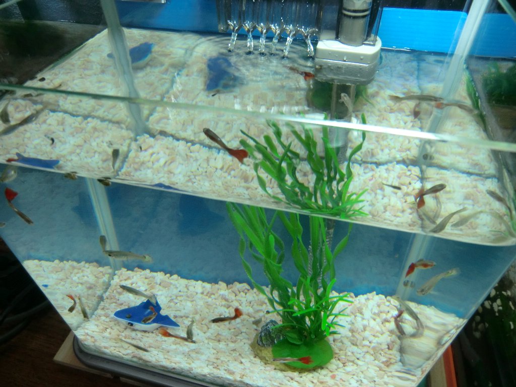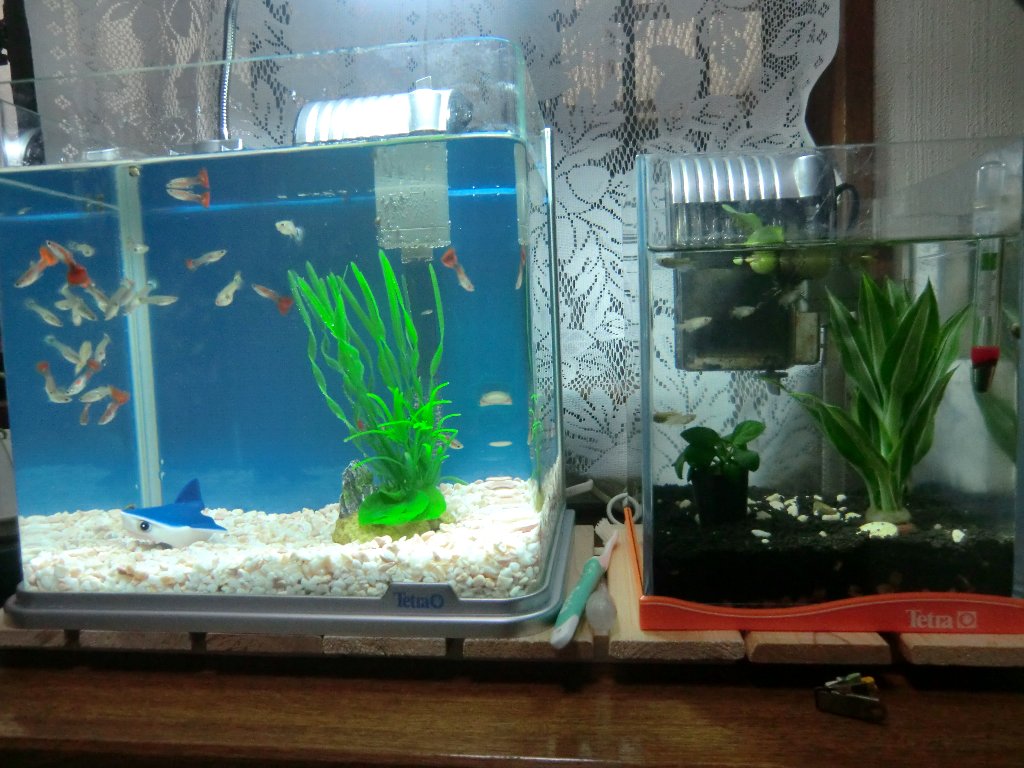 我が家では、庭の瓢箪池に金魚、家の中にメダカを飼っているのだが、前々から上の息子の家族から増えすぎたグッピーを飼わないかと誘われていたので、熱帯魚にチャレンジしたことがないのとグッピーなら飼いやすいので飼う事に決め、近くのカインズホームで中型の水槽を購入してセットアップ。 9月4日(日)曇り時々風雨 前日のゴルフは下の息子が参加予定で帰ってきていたが中止のため、午前中はゴルフ練習場に出かけてストレス解消。午後、上の息子家族が増えたグッピーを水槽ごと持ち込んできた。2世のオス・メス20数匹とそれらの子(3世)3匹の大量であったが全ていただくことにした。メダカの水槽と並べたがメダカの地味さが目立つ、どちらもそれぞれの特長があり癒されるので差別せずに飼育頑張ろう!、金魚も!