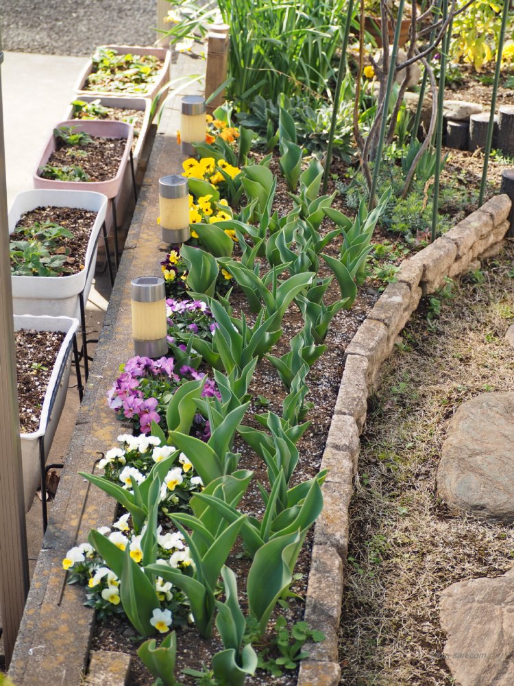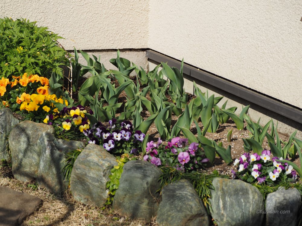 庭のチューリップが大きく成長して蕾が出てくるのではないか、今年もたくさんのチューリップを楽しめそうである。 そしてチューリップの脇にはビオラがきれいに咲き誇っている。