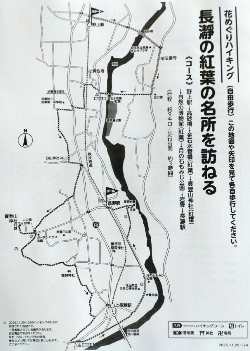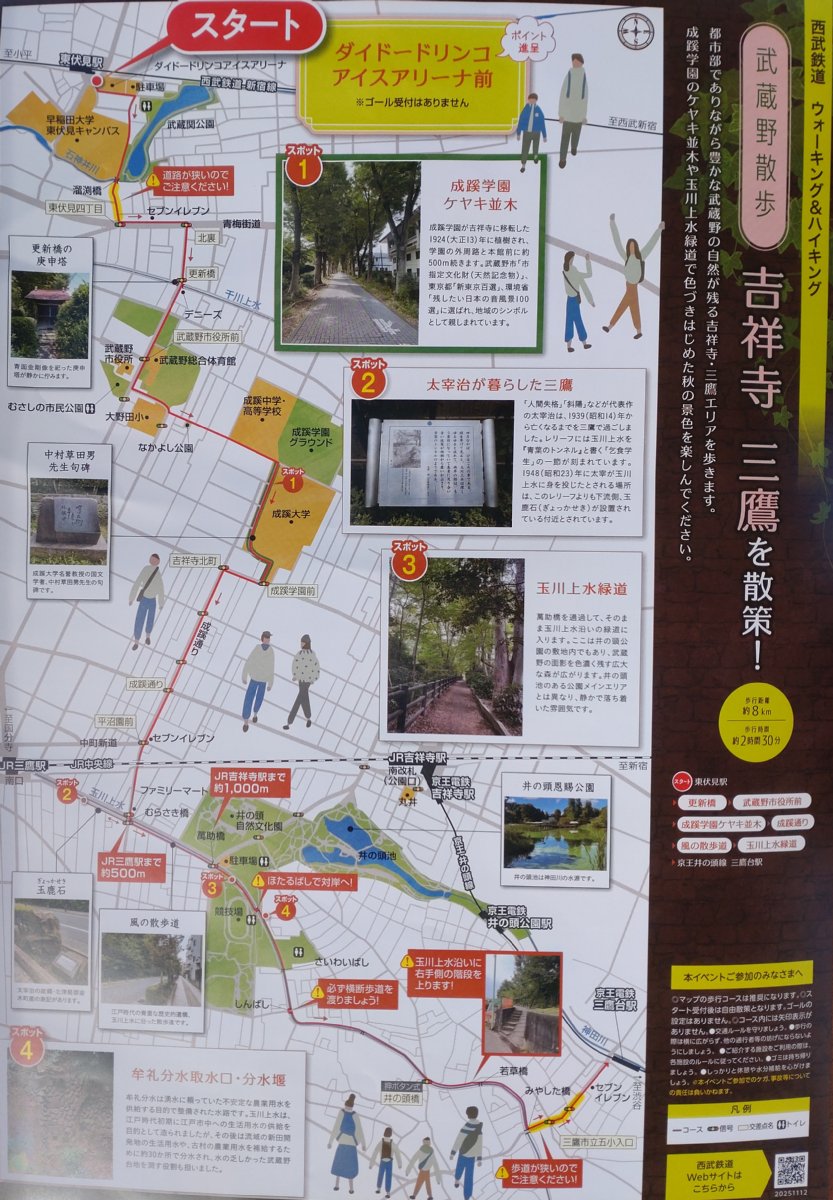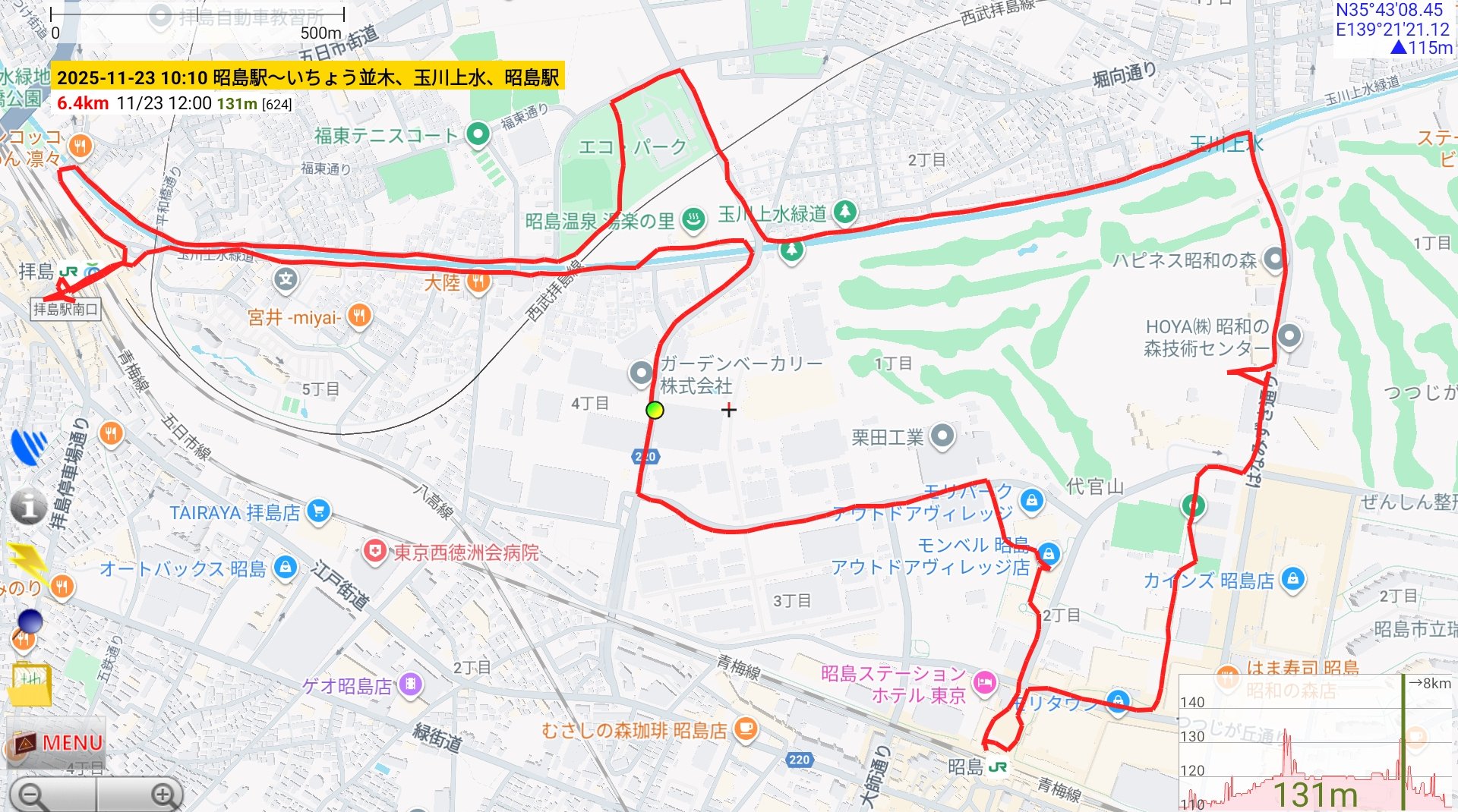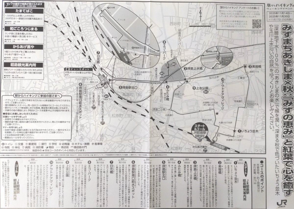 ★2025年11月23日(日) 曇り/晴れ、気温(青梅)15.0/5.7℃、JR東日本、みずまちあきしまX秋:「みずの恵み」と紅葉で心を癒す 昭島のいちょう並木の紅葉と玉川上水の紅葉を楽しめたウォーキングであった。 ゴール後に観光案内所でアンケートに答えて「あきしまの水」アルミボトル缶をいただいた。 ★2025年11月21日(金) 晴れ、気温(青梅)17.4/1.9℃、秩父鉄道、長瀞の紅葉の名所を訪ねる 朝の冷え込みは厳しかったが快晴で穏やかなウォーキング日和であった。 荒川(金石水管橋)・宝登山神社・月の石もみじ公園、長瀞狭と紅葉が見ごろのコースを満喫した。 ★2025年11月12日(水) 晴れ|曇り、気温(青梅)13.9/4.4℃、西武鉄道、武蔵の散歩 吉祥寺・三鷹を散策! 晴れてはいるが雲が多くどちらかというと曇り日という感じの中のウォーキング。 成形学園前のケヤキ並木は紅葉が始まっており黄色が綺麗、井之頭公園からの玉川上水緑道はとても爽やかに歩けた。 ★2025年11月01日(土) 、気温(青梅)20.4/10.8℃、JR東日本、奥多摩の大自然と渓谷美を堪能!大多摩ウォーキングトレイルを歩く コースが前日夜の雨でぬれておりとても滑りやすい状態で多くのアップダウンと階段の登り下りがありとてもタフなウォーキングであった。 コース途中には3日前にクマが出没したとの注意看板があり不安なウォーキングでもあった。 ★2025年10月22日(水) 雨、気温(青梅)13.0/10.1℃、西武鉄道、入間川沿い安比奈親水公園を歩く! 生憎の雨の中でのウォーキングである、小雨がスタートからゴールまで続いていた。 雨のため休憩するとこも少なくひたすら歩いてゴールを目指した、安比奈親水公園のコスモスは終わりに近く残念。 ★2025年10月15日(水) 曇り、気温(青梅)21.5/14.4℃、西武鉄道、千川通りの桜並木を歩く! 井草森公園から練馬駅まで千川通りを歩く、桜並木は桜の咲く季節に歩きたい。 曇りで平年よりやや低い気温で歩くにはとてもよいコンディションであった。 コース距離が5?と短かったのが物足りない。 ★2025年10月04日(土) 曇り、気温(青梅)22.5/18.2℃、秩父鉄道、ロングウォークちちぶ路 雨の予報が出ていたが曇りで気候も良くウォーキングに適した日であった。 16?コースを歩いたがアプリでの計測では13?ほどであtった。歩行時間約4時間。 コースは秩父駅スタート・秩父公園橋・札所23番・メープルの森・札所21番・蒔田サテライト工業団地・皆野橋・皆野駅ゴール ★2025年09月27日(土) 晴れ|曇り、気温(青梅)28.7/19.6℃、JR東日本、秋川エリアの歴史と自然満喫コース 昨日は真夏日で暑かったが今日は清々しい陽気でウォーキング日和。 秋川駅スタートで秋川遊歩道、東秋留橋、二宮神社、都立秋留台公園、ゴールはスタートの秋川駅の周回コース ★2025年09月17日(水) 晴れ、気温(青梅)35.2/23.0℃、西武鉄道、「千川上水を踏破!」武蔵野の屋敷林をめぐる! 猛暑日となった、とてもつらいウォーキングであった。 蒸し暑く汗だくで途中道を間違えるなどして、集中力が散漫ながら歩き切った。 ★2025年09月10日(水) 晴れ/曇り、気温(青梅)32.9/24.2℃、西武鉄道、八国山緑道から荒幡富士へ 佐山丘陵を歩く! 午後から曇りで時々雨、蒸し暑い中でのウォーキング。 ●八国山緑道:狭山丘陵の東端にある八国山のコナラやクヌギの雑木林。 ●荒幡富士:明治32年完成した歴史ある富士塚で、関東では最も大きな富士塚と言われている ★2025年09月03日(水) 晴れ、気温(青梅)36.2/23.9℃、西武鉄道、多摩川沿いの福生南公園、水鳥公園から五鉄通りを歩く! 9月になっても猛暑日が続いている、久しぶり(2ヶ月ぶり)のウォーキング参加。 一番暑い時間帯に歩いたので汗びっしょり、日傘をさしてではあったがこの暑さ(青梅36℃越え)には参った。 ★2025年07月02日(水) 晴れ、気温(青梅)33.2/22.3℃、西武鉄道、「千川上水を踏破!」取水口をめぐる! 今日も夏日2Wほど続いている。6月の平均気温が過去最高を記録、今月も夏日が続いて梅雨明け間近か? 新小金井駅から玉川上水緑道を歩き境水衛所跡(千川上水の取水口)から千川上水(緑道)を歩き東伏見駅がゴール。 ●千川上水:元々は5代将軍綱吉の立ち寄り先である小石川御殿、湯島聖堂、寛永寺、」浅草寺等への給水を目的として作られた ★2025年06月25日(水) 雨/曇り、気温(青梅)29.1/23.1℃、西武鉄道・JR東日本、夏の訪れを感じながら御岳溪谷遊歩道を歩く! 歩き始める直前まで強い雨であったが、御嶽駅を雨上がりで蒸し暑い中スタート。 雨でぬれた遊歩道は歩きにくかったが御岳溪谷を楽しめた。 ★2025年06月18日(水) 晴れ、気温(青梅)34.7/24.4℃、西武鉄道、玉川上水緑道を歩く! 昨日は猛暑日、今日は猛暑日一歩手前の炎天下でのウォーキング、 しかし玉川上水緑道では木陰が多く涼しい風が吹く中でのウォーキングだった。 ★2025年06月11日(水) 雨、気温(青梅)21.5/19.2℃、西武鉄道、智光山公園の花菖蒲鑑賞ピクニックへ! 昨日梅雨入りした、昨年より11日早く平年より3日遅い。 今日は雨の中を智光山公園の花菖蒲鑑賞のウォーキング、智光山