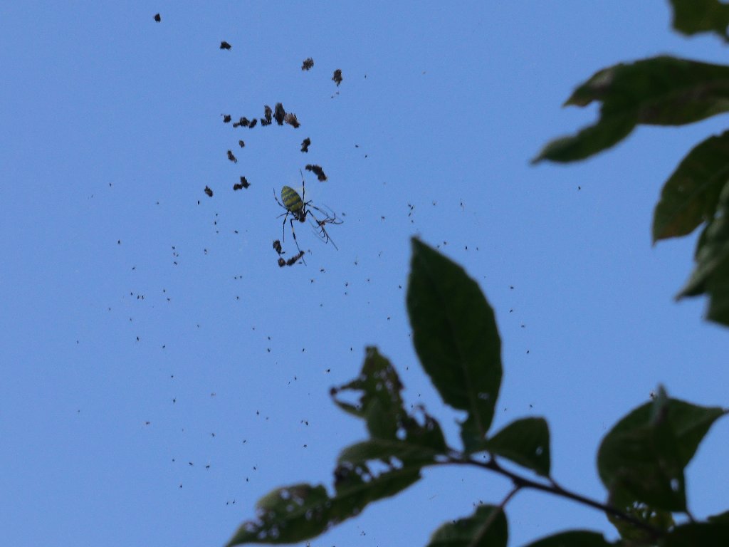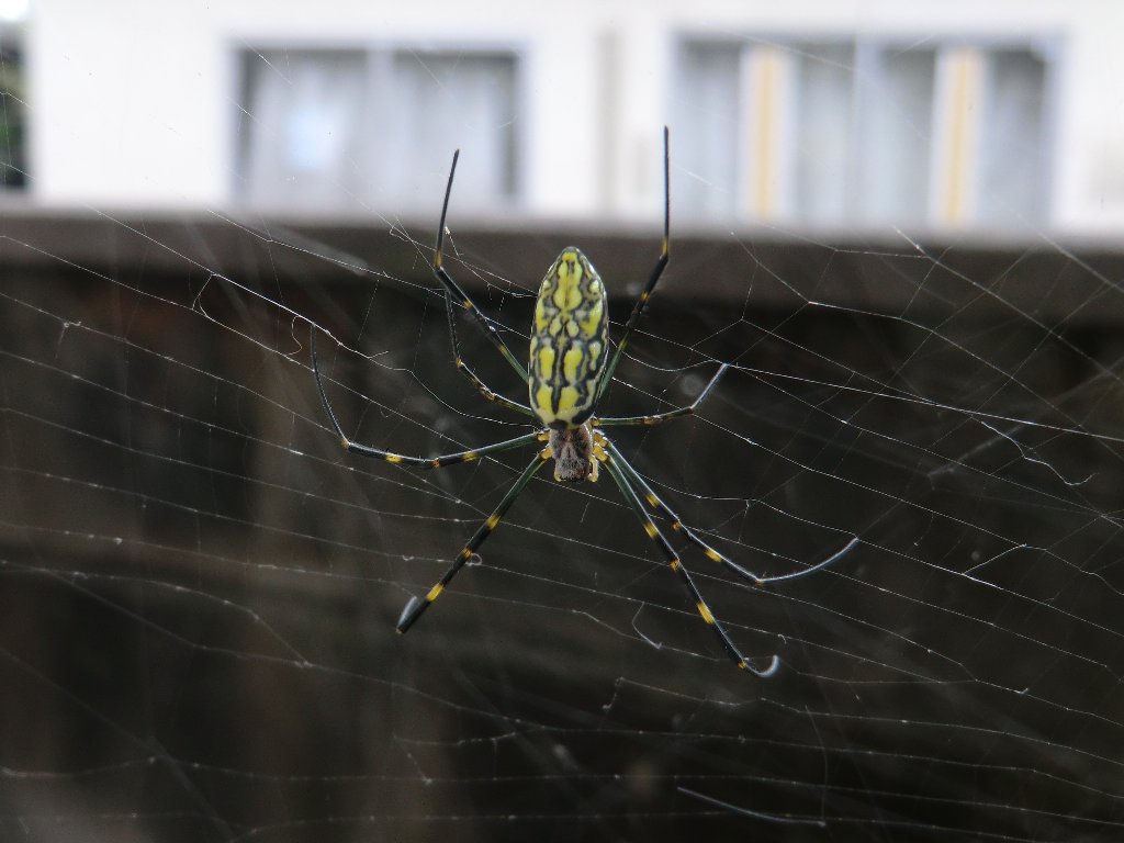 珍しい蜘蛛を見つけた。ジョロウグモで漢字名は「女郎蜘蛛」と書く。 腹部が黄色と暗青色の縞模様のある大きなクモで夏から秋にかけて本州でよく見かけるとのこと。 玄関横の庭木と壁の間に網を張って昆虫を捕らえて生活しているみたいで、網の一部に食べ残した昆虫の残骸があった。 捕殺しようと思ったが、しばらく生活の様子を見ることにした。 しばらくの間、玄関横で移動しながらも網を張って生活していたがいつの間にかいなくなってしまった。が、同じ蜘蛛かわからないが庭の梅もどきの木と電話線の間に網を張っていた。よく見ると小さな雄蜘蛛も生活している。 しかし、11月6日(日)現在ではどこかに移動したのかいなくなっている。