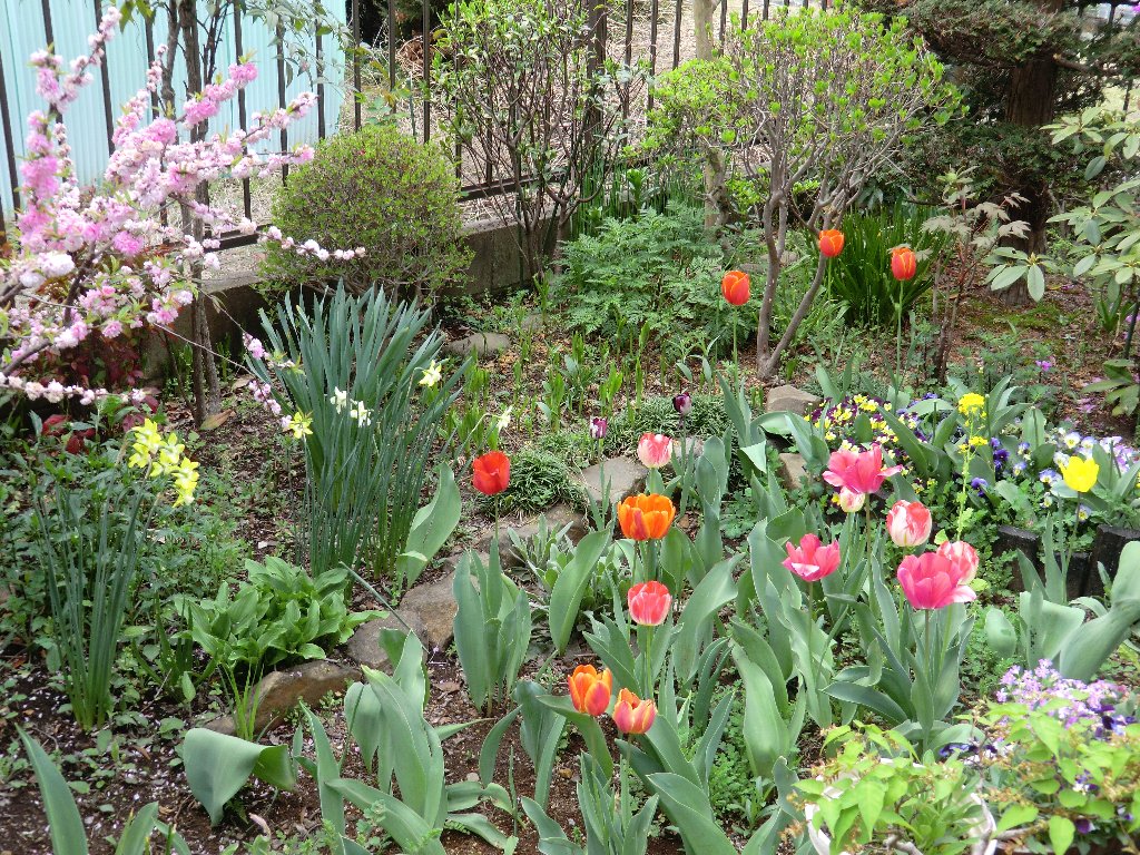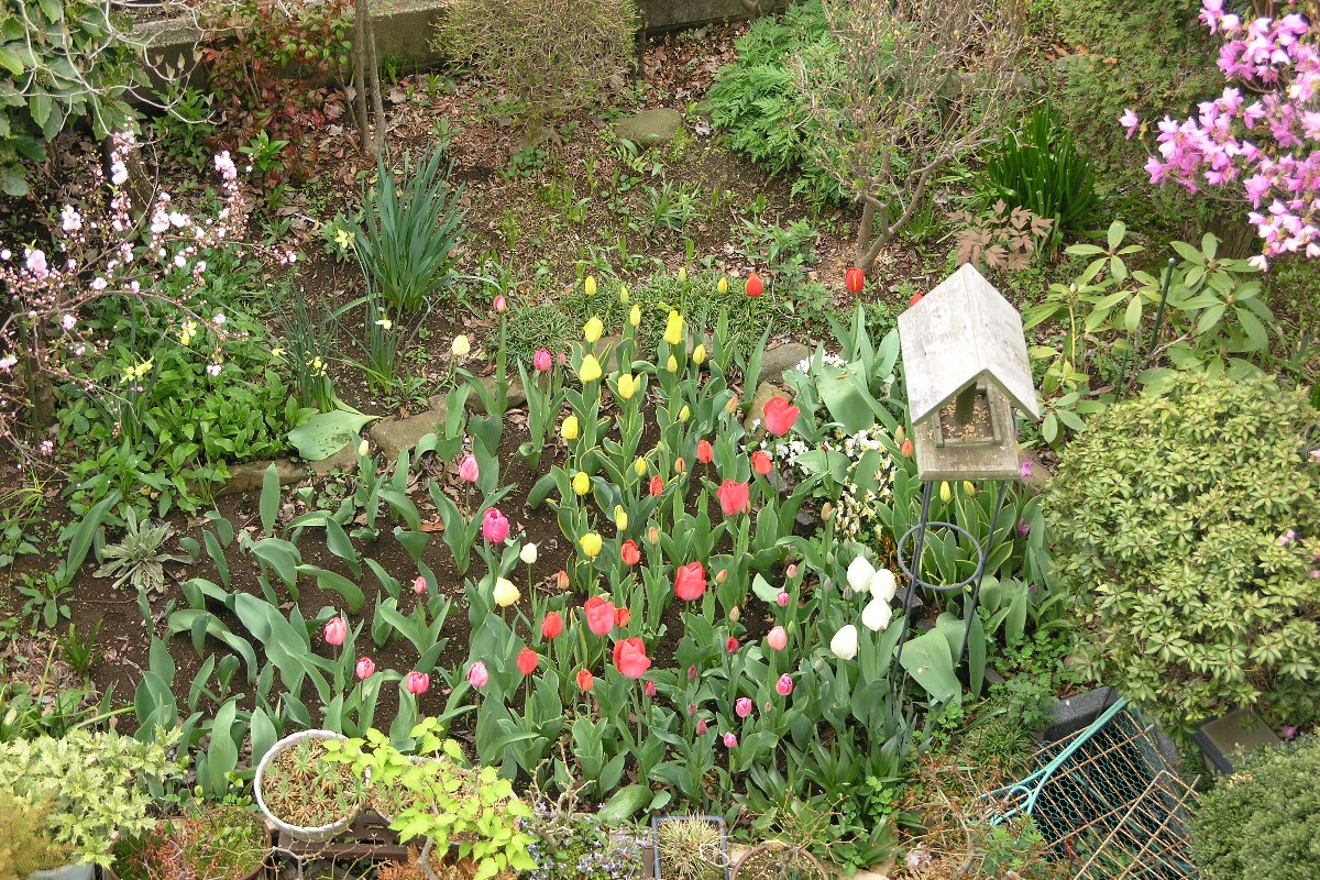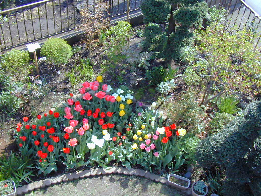 今年のチューリップの開花状況です。少し植付けた球数が少なかったのと種類がまばらだったので思っていたほど咲きが悪かった。 今秋はもう少し球数を増やし、種類・色をそろえて植付けてみよう。 ----------------------------------------------------------------- 2011年11月4日(金)晴れ、気温22℃ チューリップを沢山植付けました。ここ5・6年はチューリップを植付けたままのため咲く花数が少なり開花時が寂しくなったので、久しぶりに新たな球根の買込みと植付けたままの球根を掘り起こし、あわせて約120球ほど植付けた。 このチューリップが開花すると2000年のような花が楽しめるのではないかと期待する。