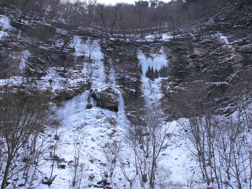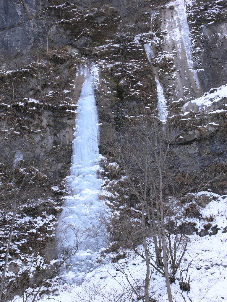 大滝からさらに30分ほど奥にある中津川渓谷の「中津川出合の氷壁」は高さ80m、幅100mほどの岸壁のあちこちに氷柱が垂れ下がっている。見事なものである。あまり有名ではないのと奥地のためか観光客はごく少数であった。また風があり非常に寒い。 滝のような氷壁(氷柱)は一見に値する。地元の方によると見ごろの時期は雪の多い2月中旬だとのこと。 ![]()
