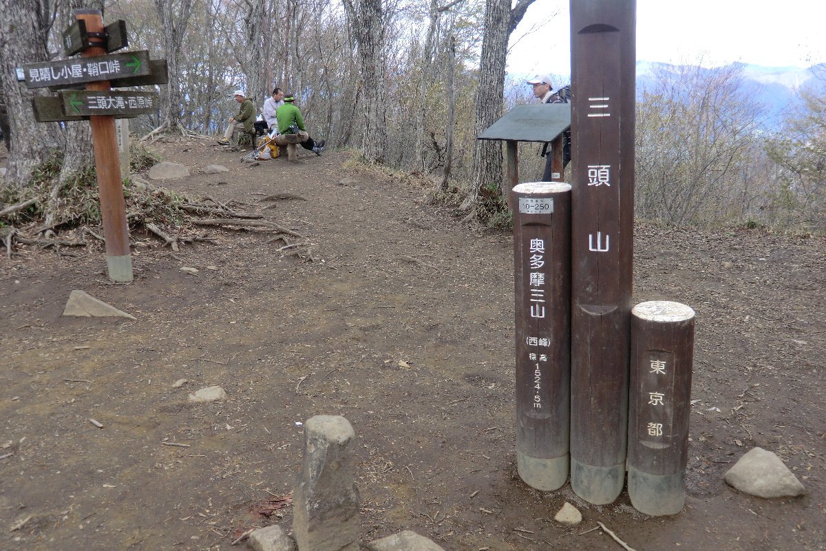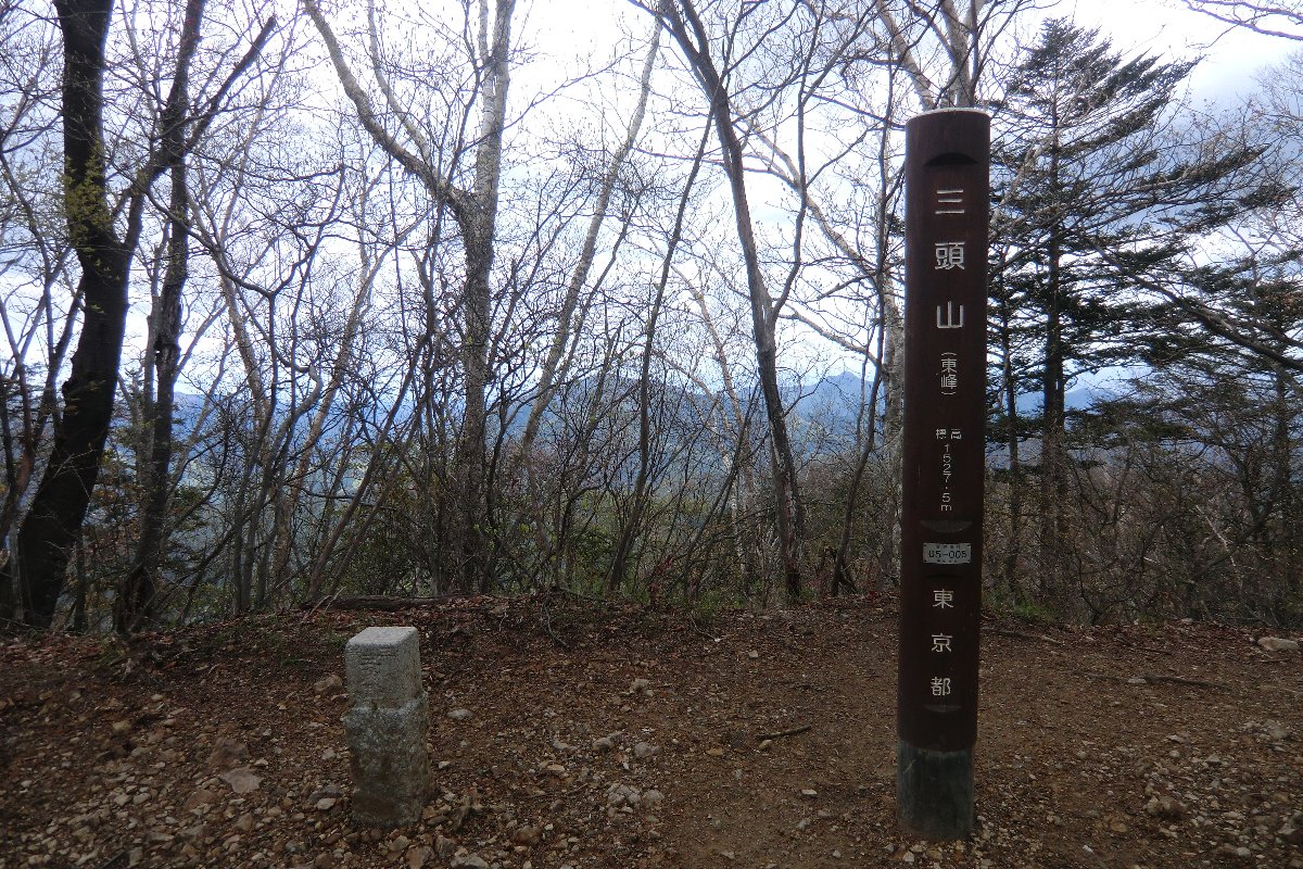 三頭山の中腹にある三頭大滝を眺めるのを目的に、三頭山に登った。 奥多摩三山(三頭山、御前山、大岳山)の最高峰・三頭山(みとうさん)は頂上稜線に3つのピークがあることが山名の由来とか。三頭山・中央峰(1531m)、東峰(1527m)、西峰(1524m)が、ほぼ同じくらいの高さで、間隔も歩いて2~5分くらい。 桧原村の「都民の森」駐車場をスタート(9:20)→鞘口峠(9:47)→東峰(10:51)→中央峰(10:53、休憩)→西峰(11:06)→ムシカリ峠(11:23)→三頭大滝(12:00)→都民の森駐車場ゴール(12:28)、標高差540m、歩行時間3時間強(都民の森は標高990m) 西峰からは北は雲取山、南側は富士山、三つ峠が望めて眺めが良い。東峰(見晴台から)奥多摩の鷹ノ巣山などの山々の眺めが良い。中央峰は木立に囲まれて休憩する場所。