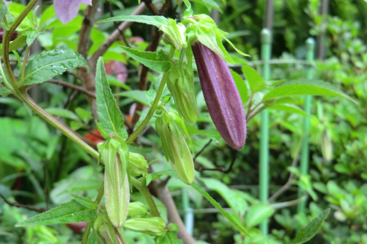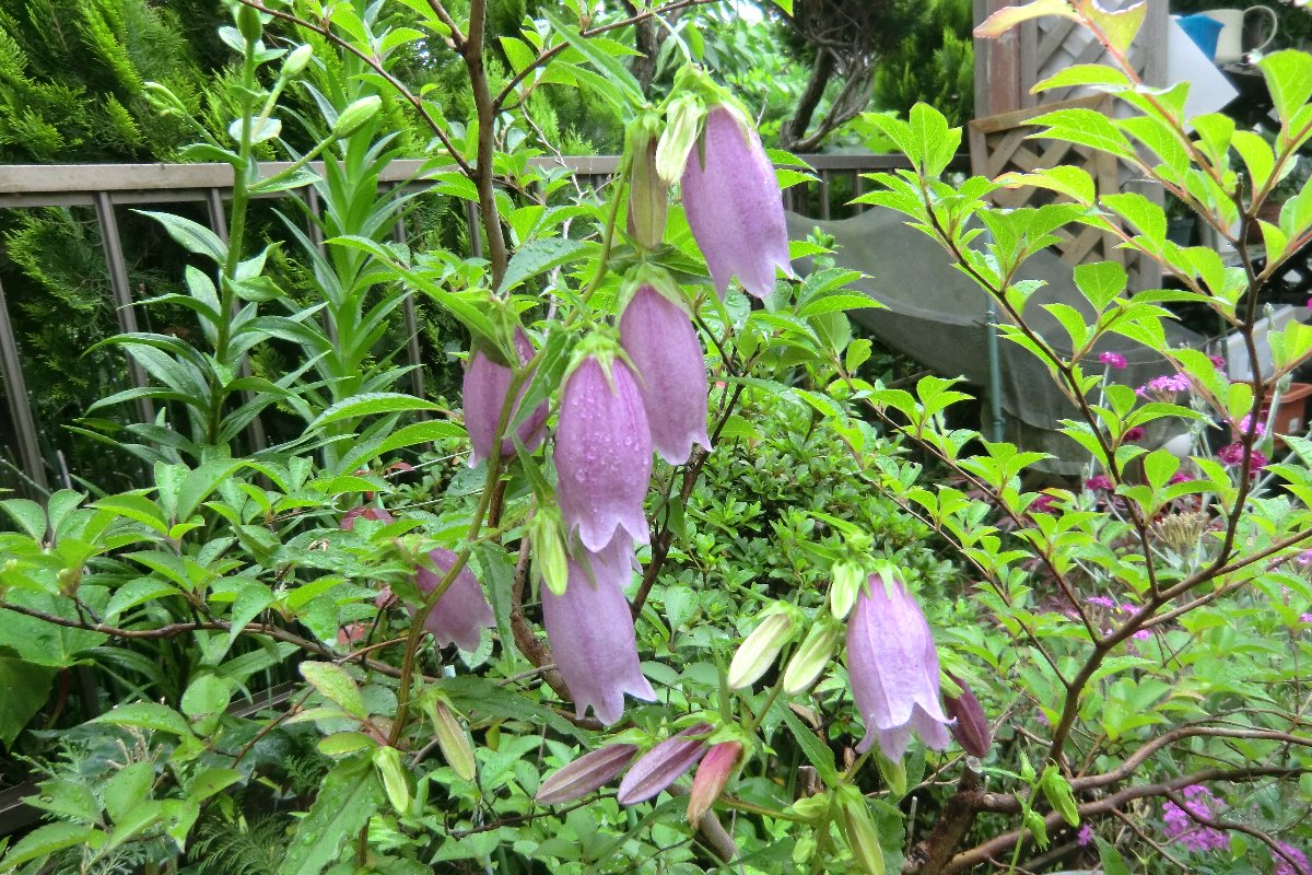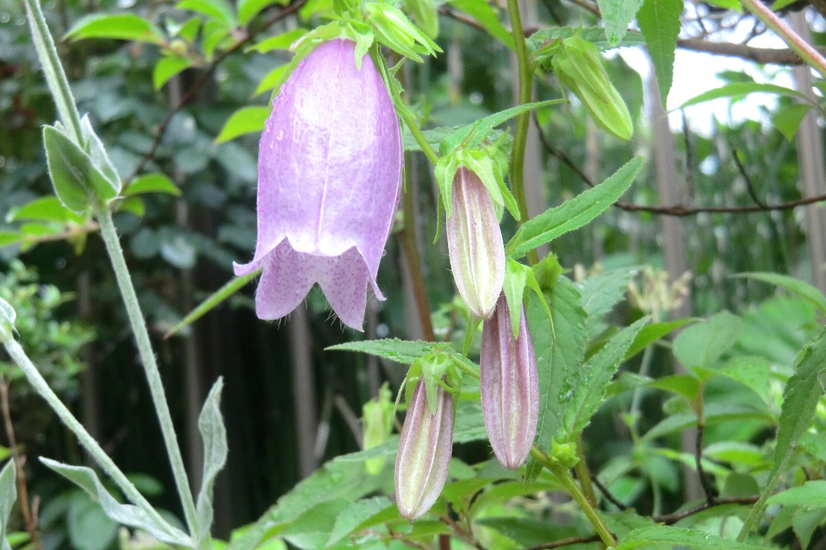 庭のホタルブクロ(蛍袋)が咲き始めました。 4・5年前に実家から貰ったホタルブクロが増えて庭の彼方此方で赤紫色で釣り鐘状の花を咲かせている。(ホタルブクロの蕾) ホタルブクロはキキョウ化の多年草で初夏に花茎を延ばし大きな釣り鐘状の花を咲かせる。花色は赤紫と白色がある。山野草ながら暑さに強いみたいで我が家では毎年種からと思われ、増え続けている。銀杏の鉢植えにも飛び込んで育っている。