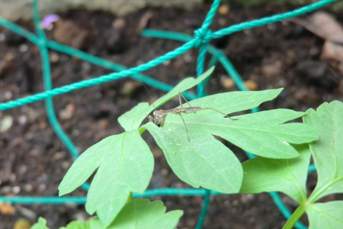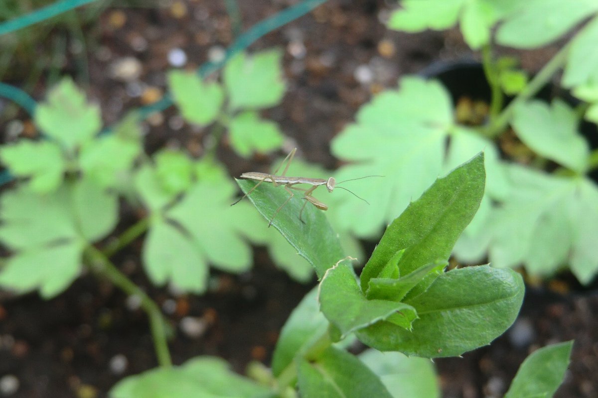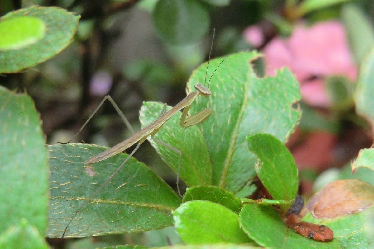 カマキリの幼虫(体長約2cm)を皐月の木で発見。卵から孵化して半月くらいだと思われる。 卵は山茶花の木に産み付けられているのを確認できている。 昨年は緑色の翅と茶色の翅の2種類を見かけ、昨年緑色の幼虫がいたが今日の幼虫は茶色の翅になるのではないか。 ------------------------------------------------------------------------------------------------ 今年も、いつもの山茶花の木に産み付けられているカマキリの卵を発見しました。昨年と同様な場所で日当たりのよい場所である。 なぜ同じ木・場所に生みつけられるのか不思議であるが、ことしも多くのカマキリが卵から生まれて庭の花木の中で生活してくれるのを楽しみにしよう。