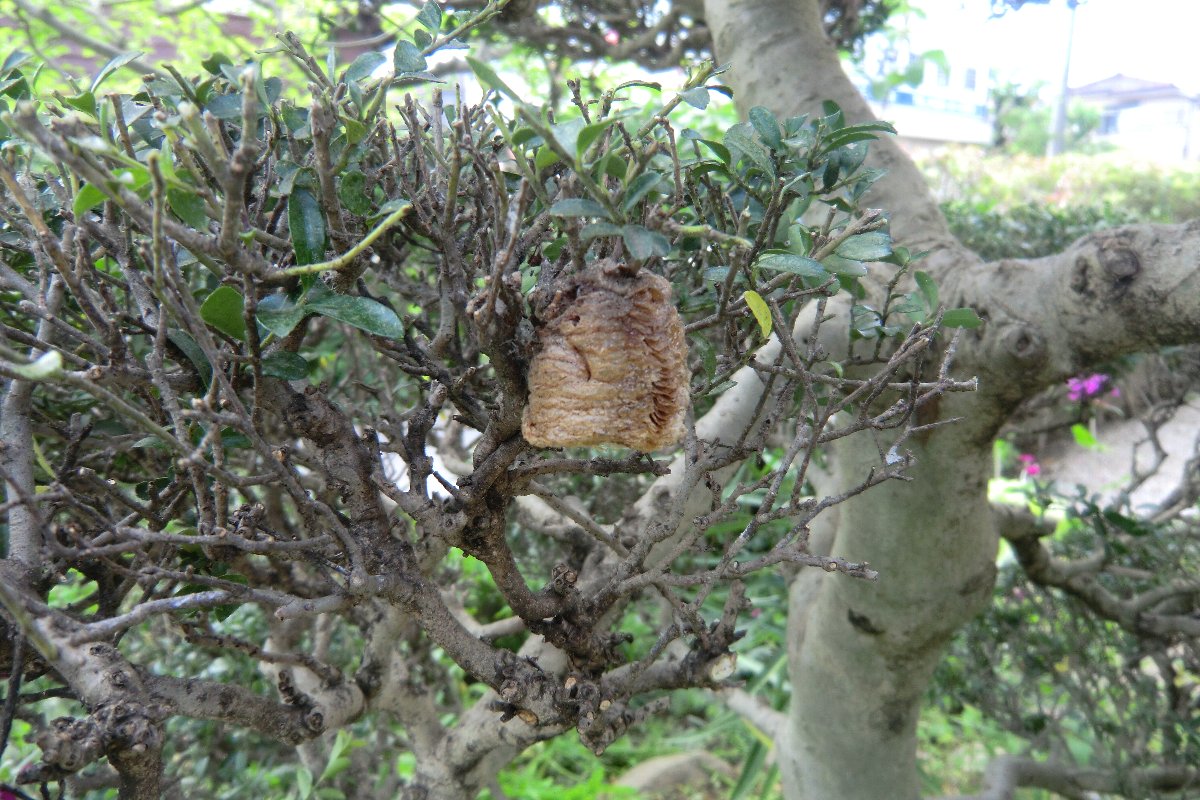 6月5日に梅雨入りから一昨日まで9日間降雨が続き今月の総降雨量は466.5mmに達し6月平均降雨量を大きくオーバーしている。 6月に入ってから庭木の手入れがなかなかできなかったが今日は爽やかに晴れたので垣根や庭木の手入れをした。 柘植の刈り込みをしていたところカマキリの卵を見つけた。すでに孵化していると思われる。 というのは今月に入ってからこの柘植の木の周囲でカマキリの幼虫を見かけているからである。 何時もは山茶花の木に卵が産みつけられるが、一昨年のリホーム時に庭の一部をカーポートにするため伐採してしまった。このため昨年は何処に産みつけられたかは不明であったが柘植の木を新たな産み場所としたみたいで、一年前と思われる古い卵もあった。